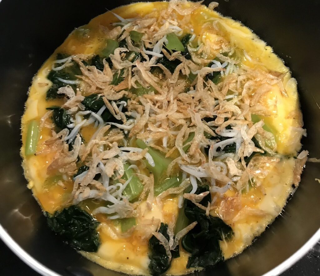 ④フライパン(鍋)に➂を入れ、小松菜が全体に広がるようにかき混ぜる。半熟になったらしらすと桜エビを加え、蓋をして2分焼く。