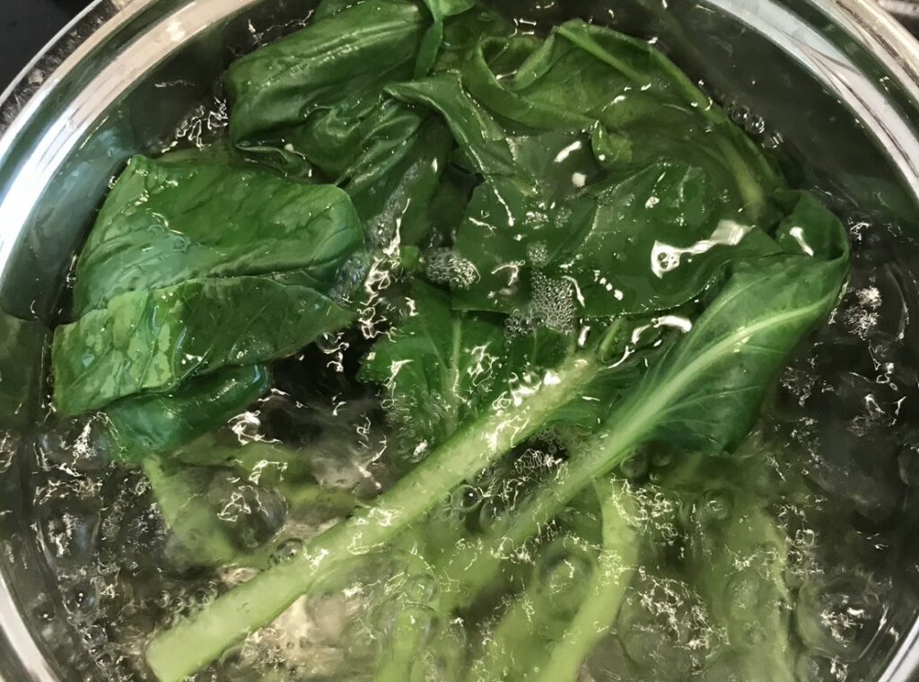 ①小松菜は根を切って水洗いし、泥を落とす。鍋にたっぷりのお湯を沸かし、茎から入れて茹でる。