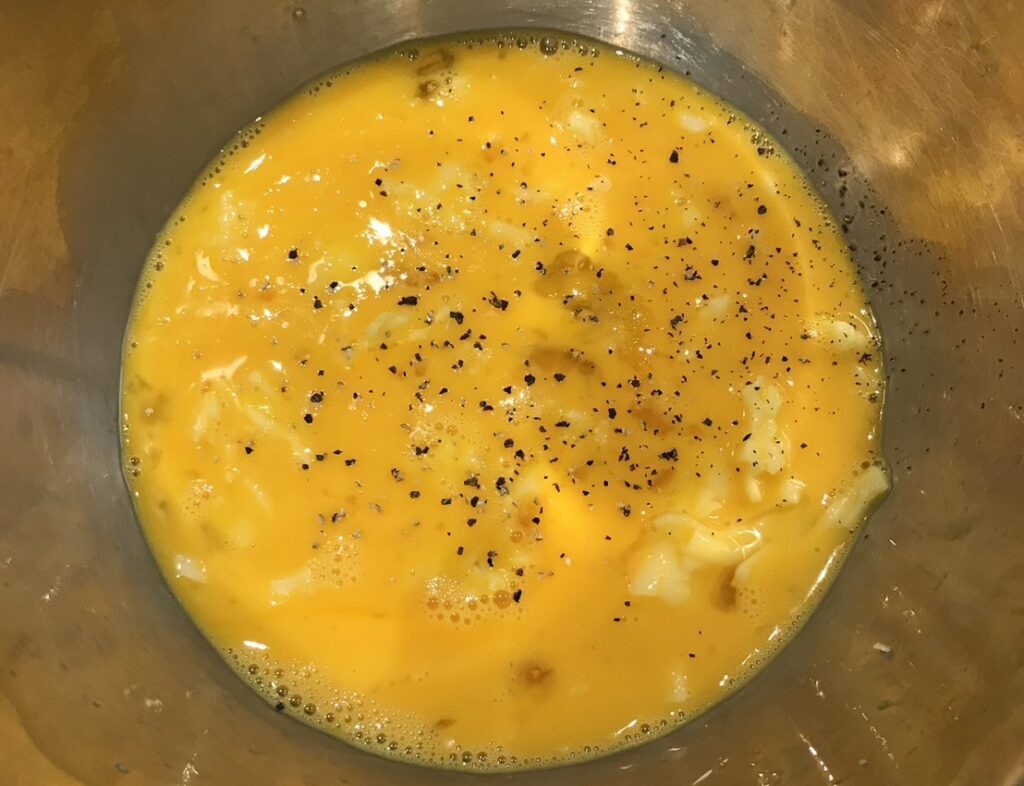 ③ボウルに卵を溶きほぐし、チーズ、塩コショウを入れる。