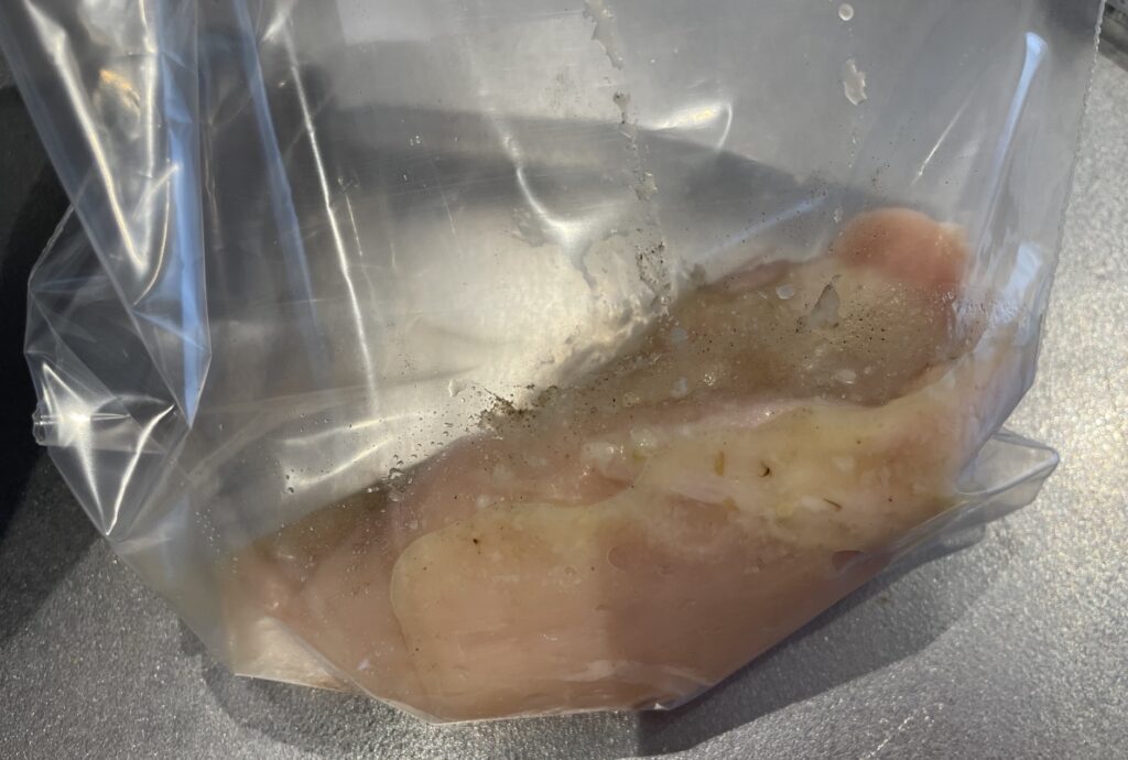 ①鶏むね肉の両面をフォークで刺し、袋に入れ、塩麹とこしょうを加える。