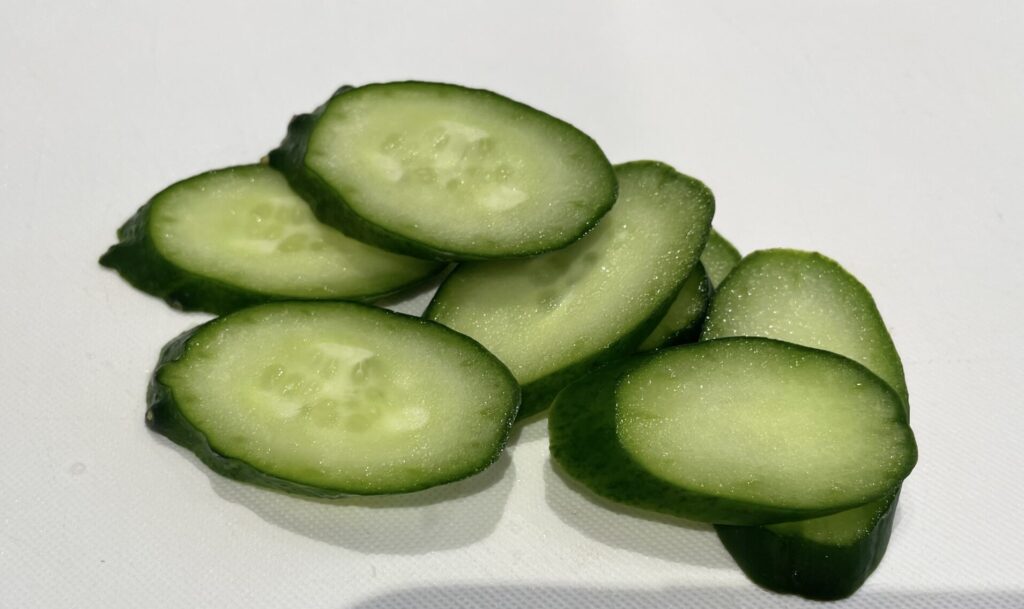 ④付け合わせのきゅうりは薄切りにし、トマトとともに皿に盛り付けておく。