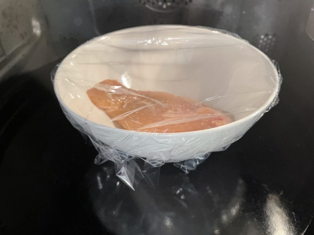 ⑤耐熱皿に鶏肉を入れ、ラップをふんわりかけて電子レンジ600W、3分加熱、裏返して1分加熱する。