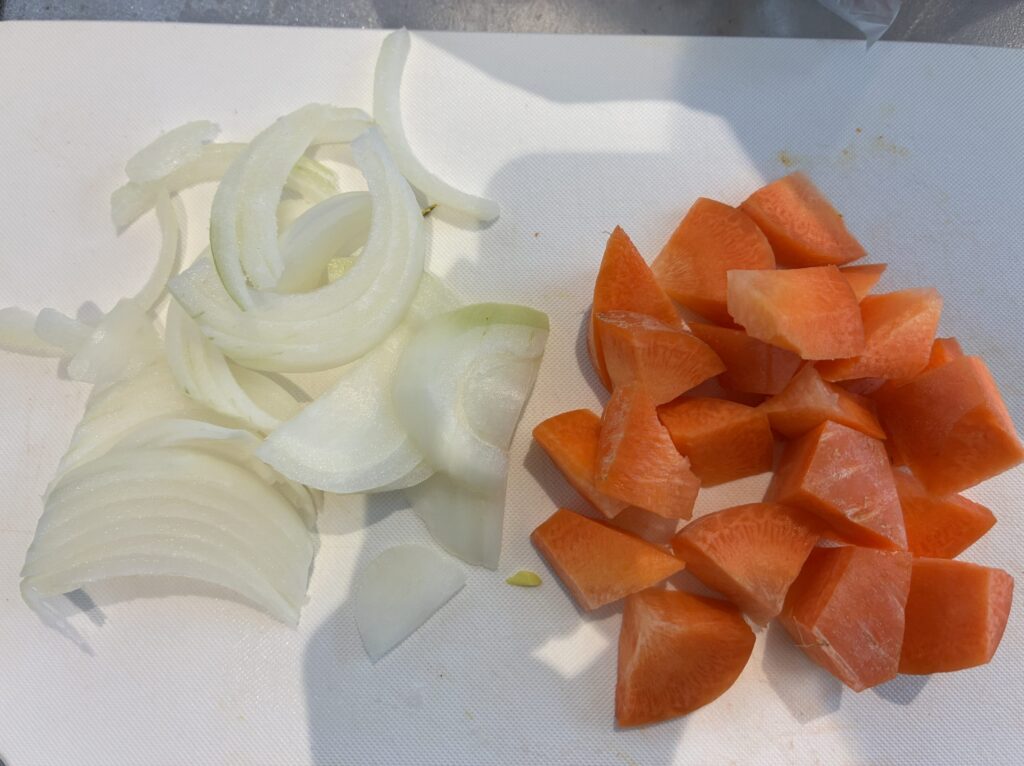 ②しめじは石づきを切り落としほぐす。ブロッコリーは小房に分ける。にんじんは乱切り、玉ねぎは薄切りにする。