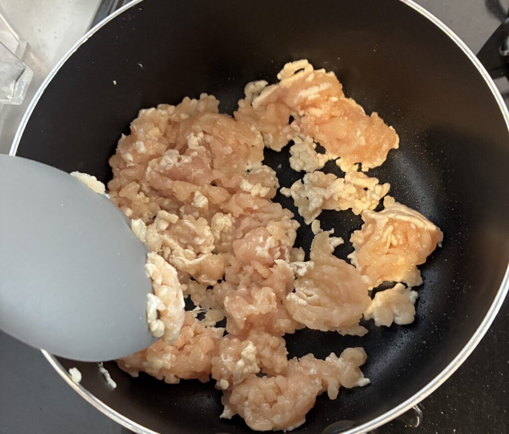 ③フライパンに油を熱し、鶏ひき肉を中火で炒める。