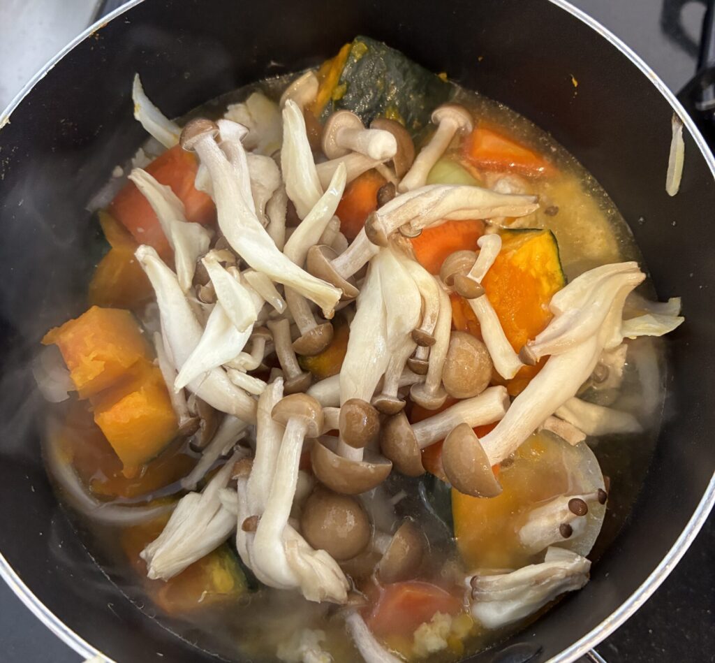 ④かぼちゃ、にんじん、玉ねぎ、しめじ、水200mlを加え、強火で煮立てる。