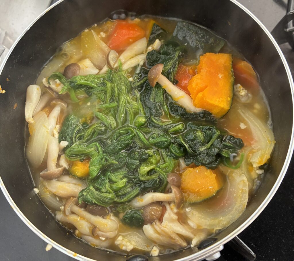 ⑤5分程煮たら、ブロッコリーとほうれん草を加えて蓋をしてさらに2~3分煮る。