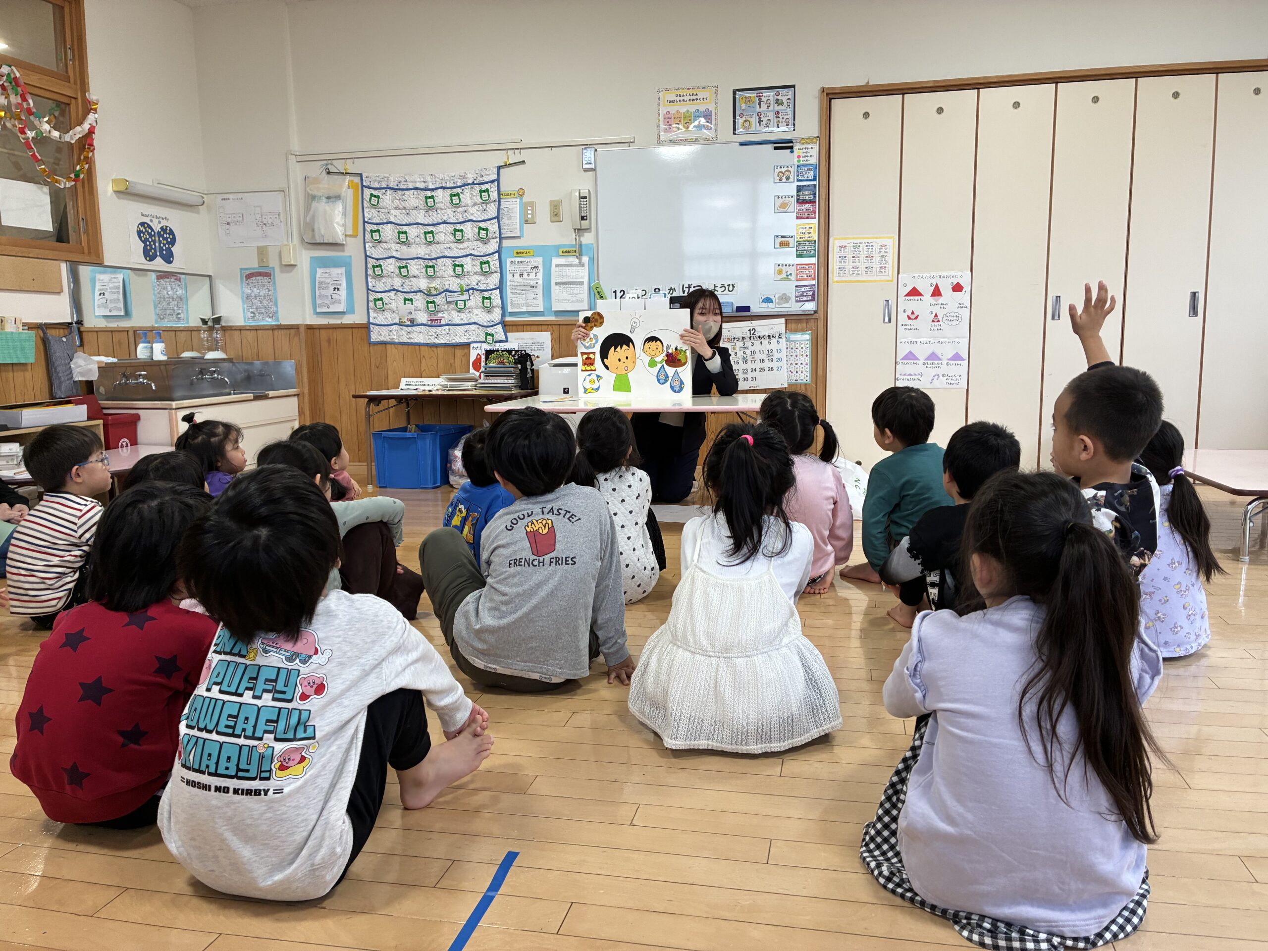 2025年12月8日(月)かんば認定こども園様にて栄養出前講座を行いました🍎 問いかけに対してまっす…