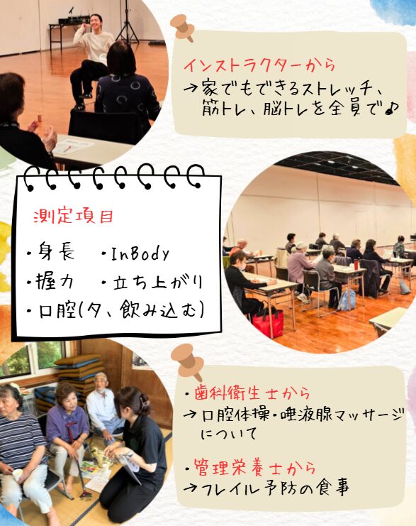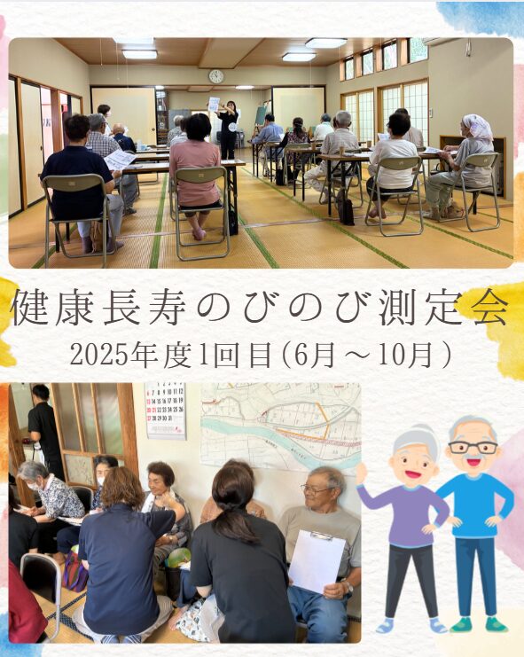 健康長寿のびのび測定会とは、由利本荘市が行っているフレイル予防のための取り組みで、年に2回、地域の町内会やミニデイ、サロンにお邪魔して身体測定や、オーラルフレイル測定、栄養講話やストレッチ等を行います✨