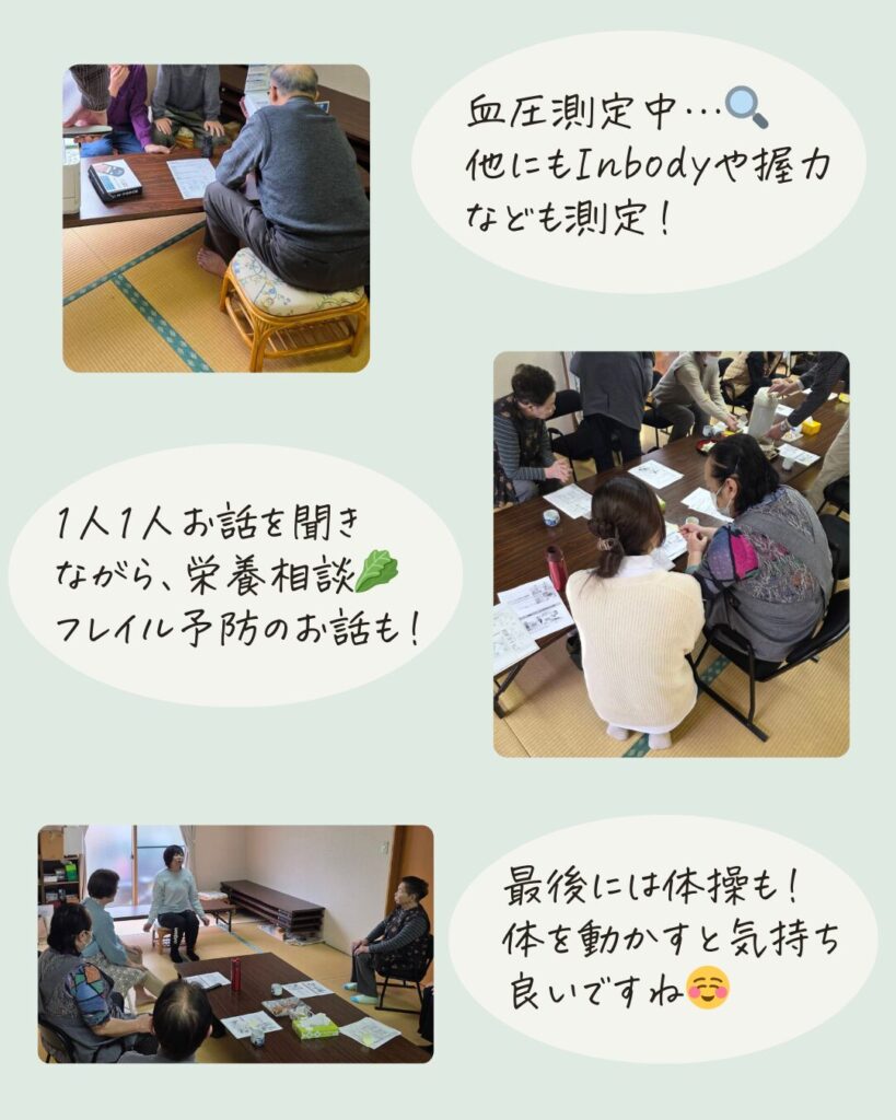 今回は血圧・体組成の測定と、フレイル予防の栄養講話、体操を行いました!